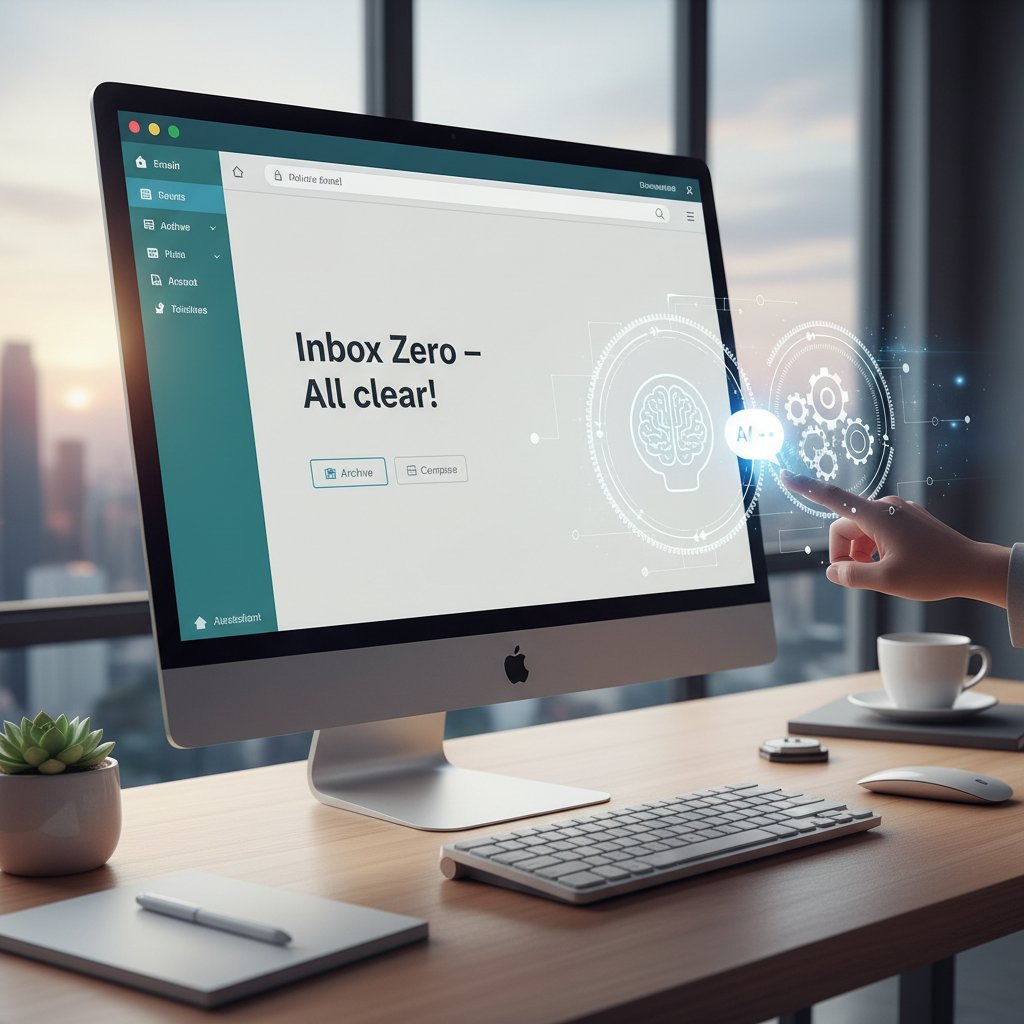 Alt text: Person looking at a decluttered, organized inbox managed by AI assistant, illustrating business productivity gains.