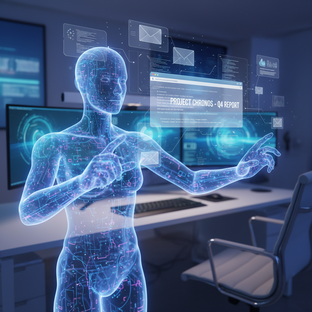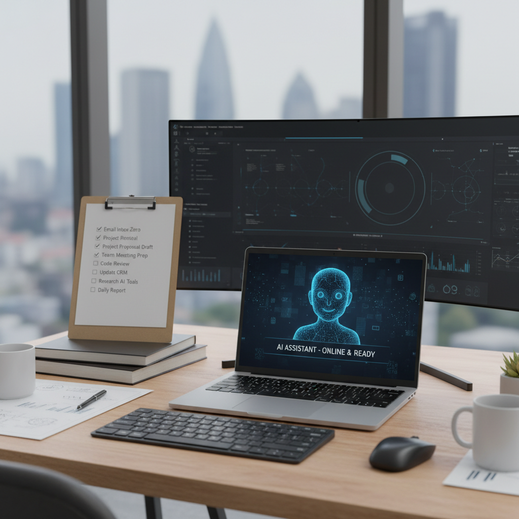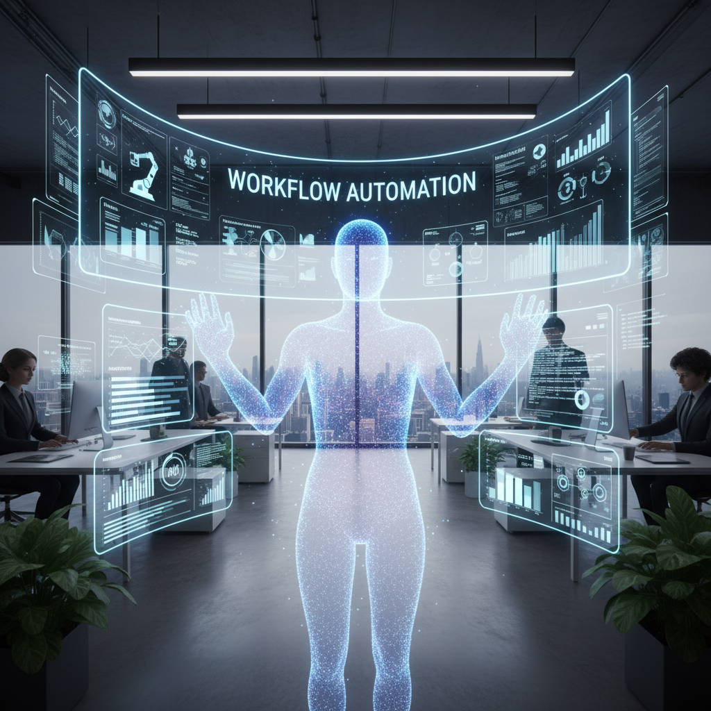 Alt text: Modern office scene with AI-driven virtual assistant and digital overlays showing workflow automation, symbolizing productivity tools.