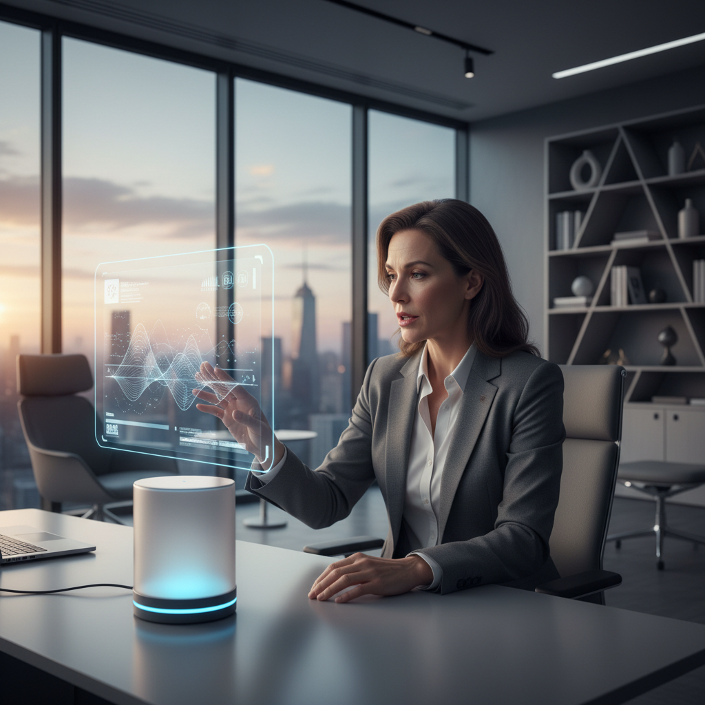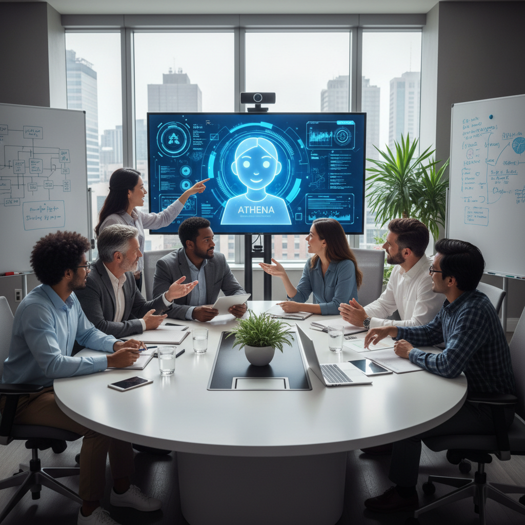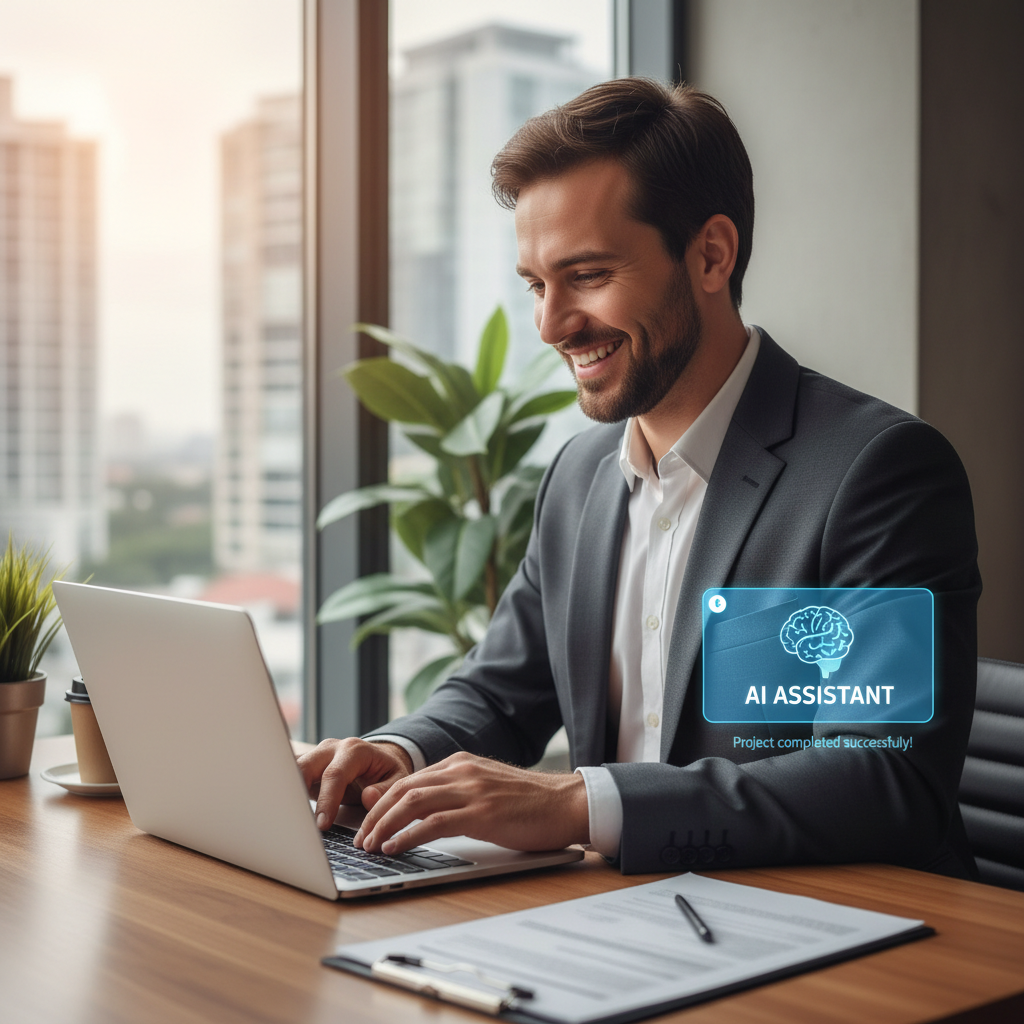 Alt text: Modern office scene with AI-driven virtual assistant and digital overlays showing workflow automation, symbolizing productivity tools.