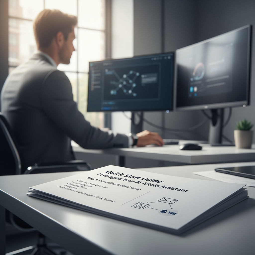 Alt text: Business professional referencing a quick start guide for implementing an AI admin assistant.