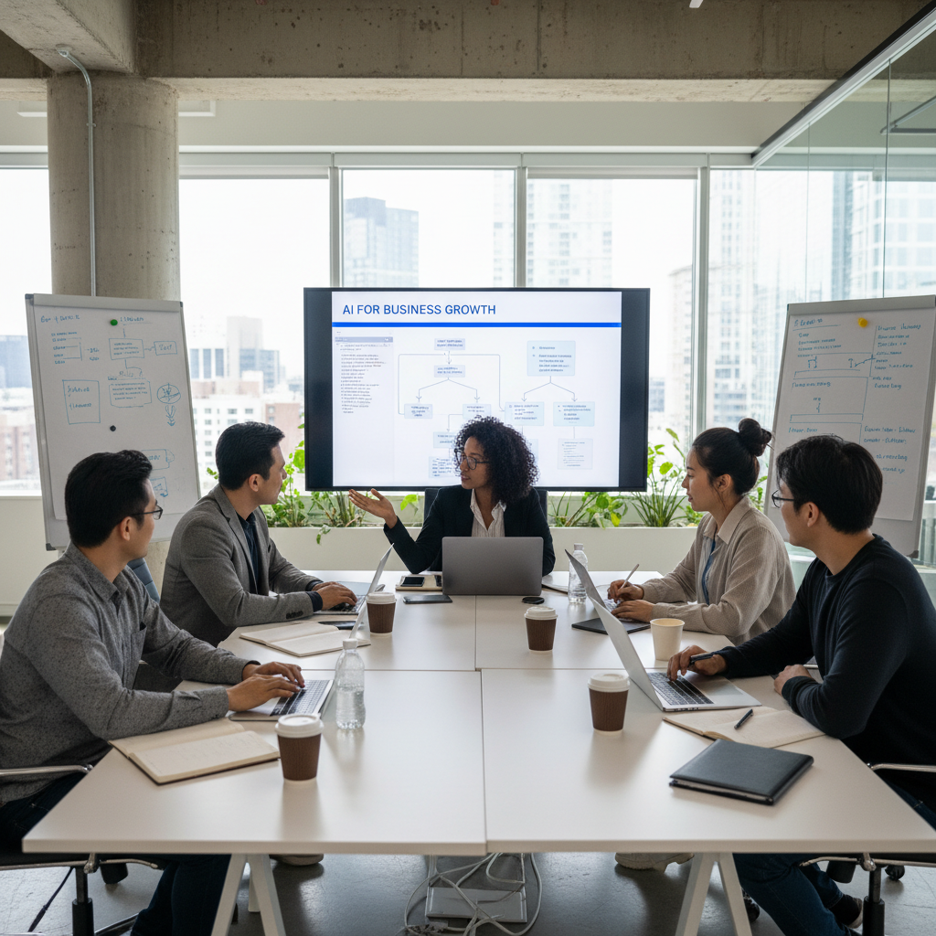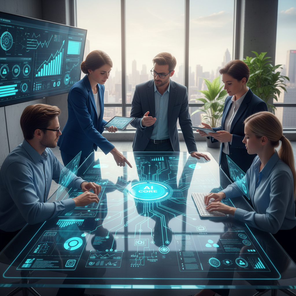 Alt text: Diverse team collaborating with AI-driven tools integrated across multiple business platforms, illustrating seamless workflow management.
