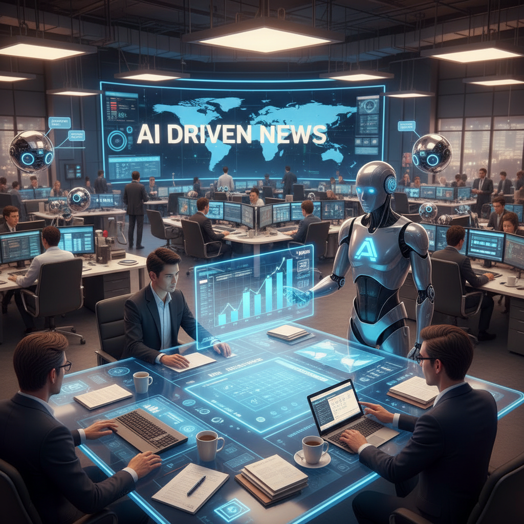Alt: AI reshaping content teams in newsrooms, with data streams and analytics screens in the background.