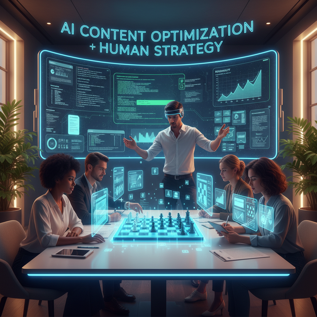 Alt: AI-driven workflow for content optimization with team members and virtual assistant technology.