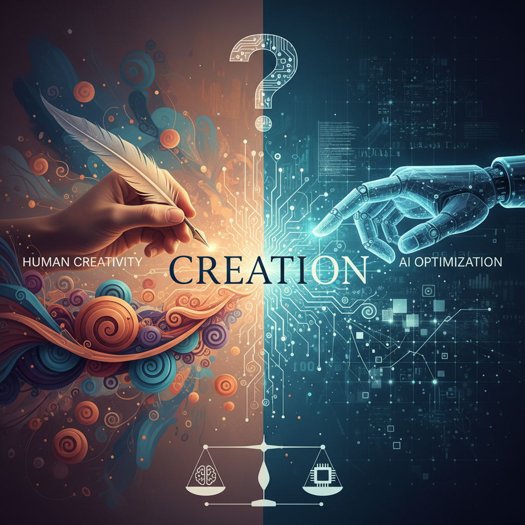 Alt: Human creativity vs AI logic in content sessions, with a writer and AI entity debating over ideas.