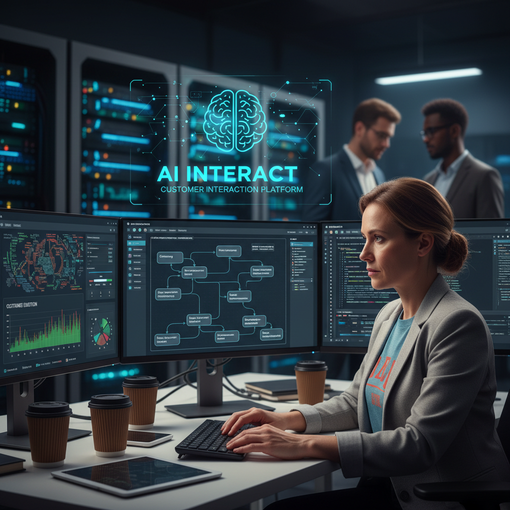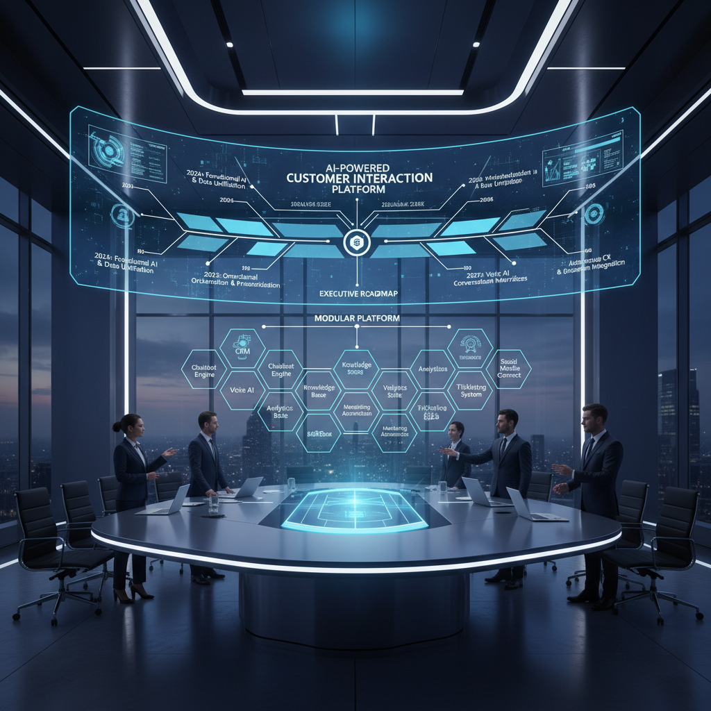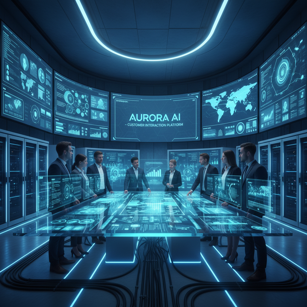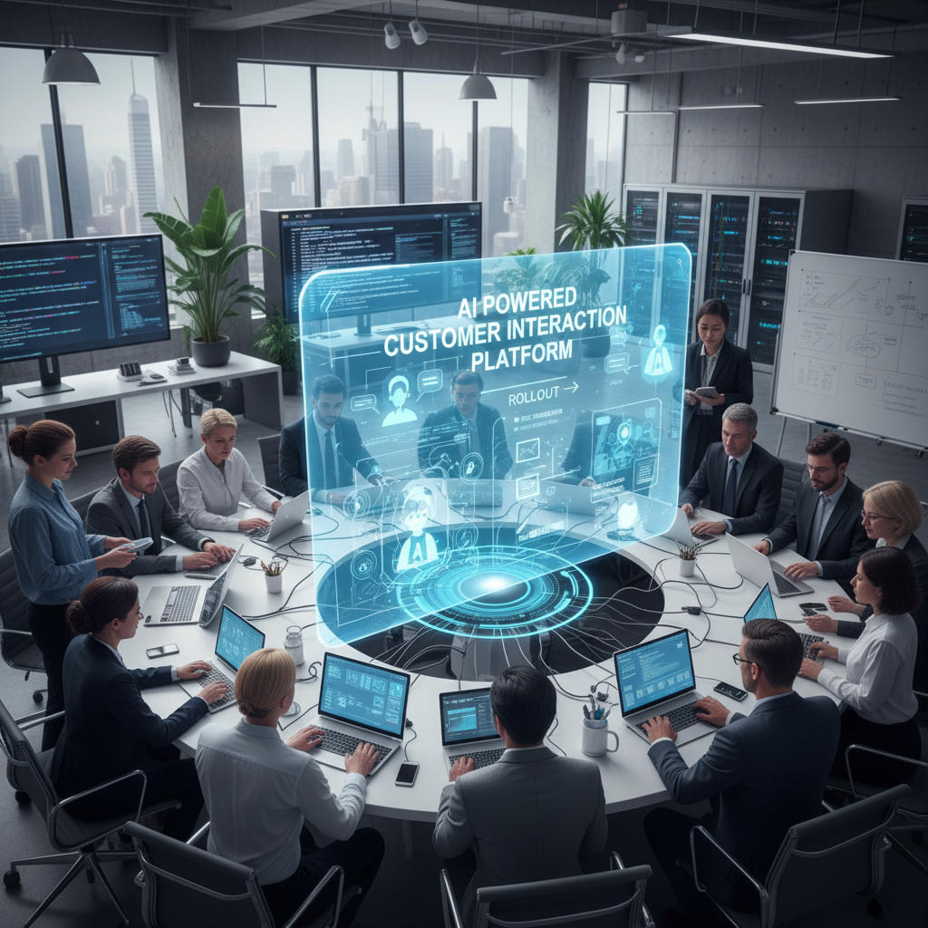 Photo: A business team in a high-tech, cinematic control room interacts with a glowing AI interface, showcasing the reality of AI-powered customer interaction platforms in 2025.