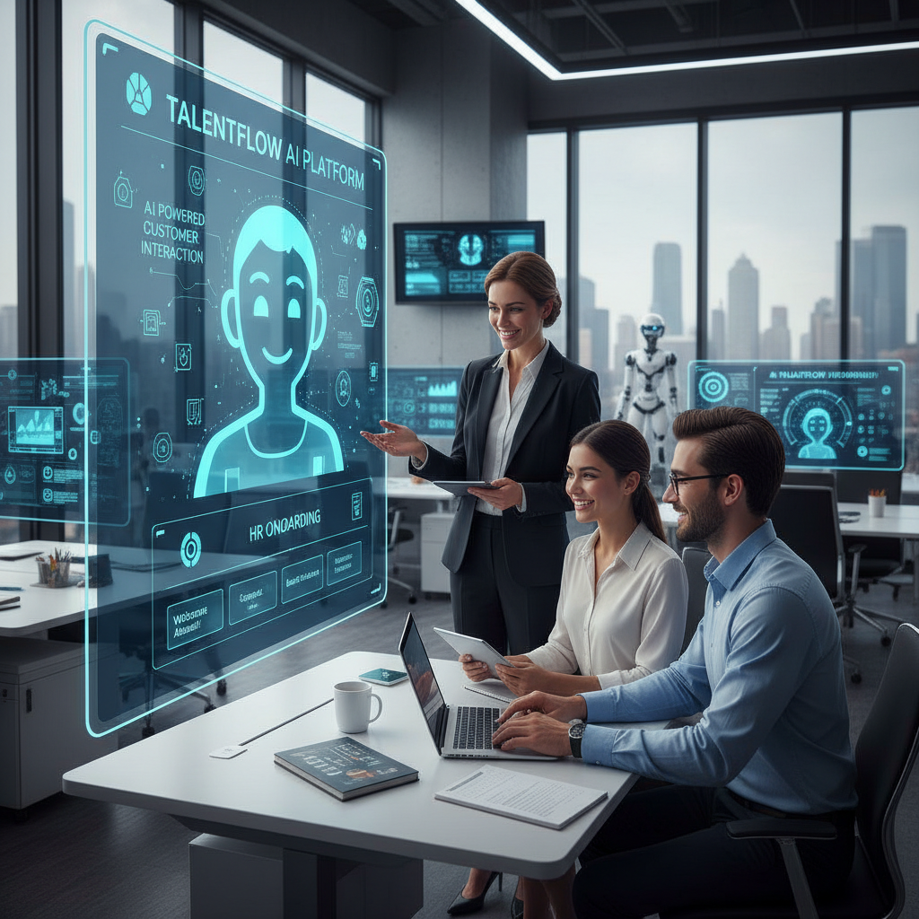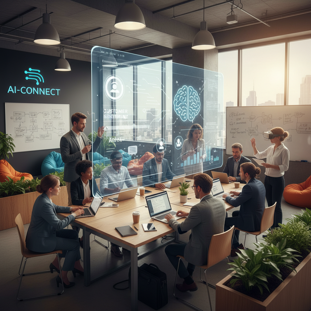 Photo: A diverse team and AI platform collaborating in a dynamic workspace, highlighting the human-machine partnership.