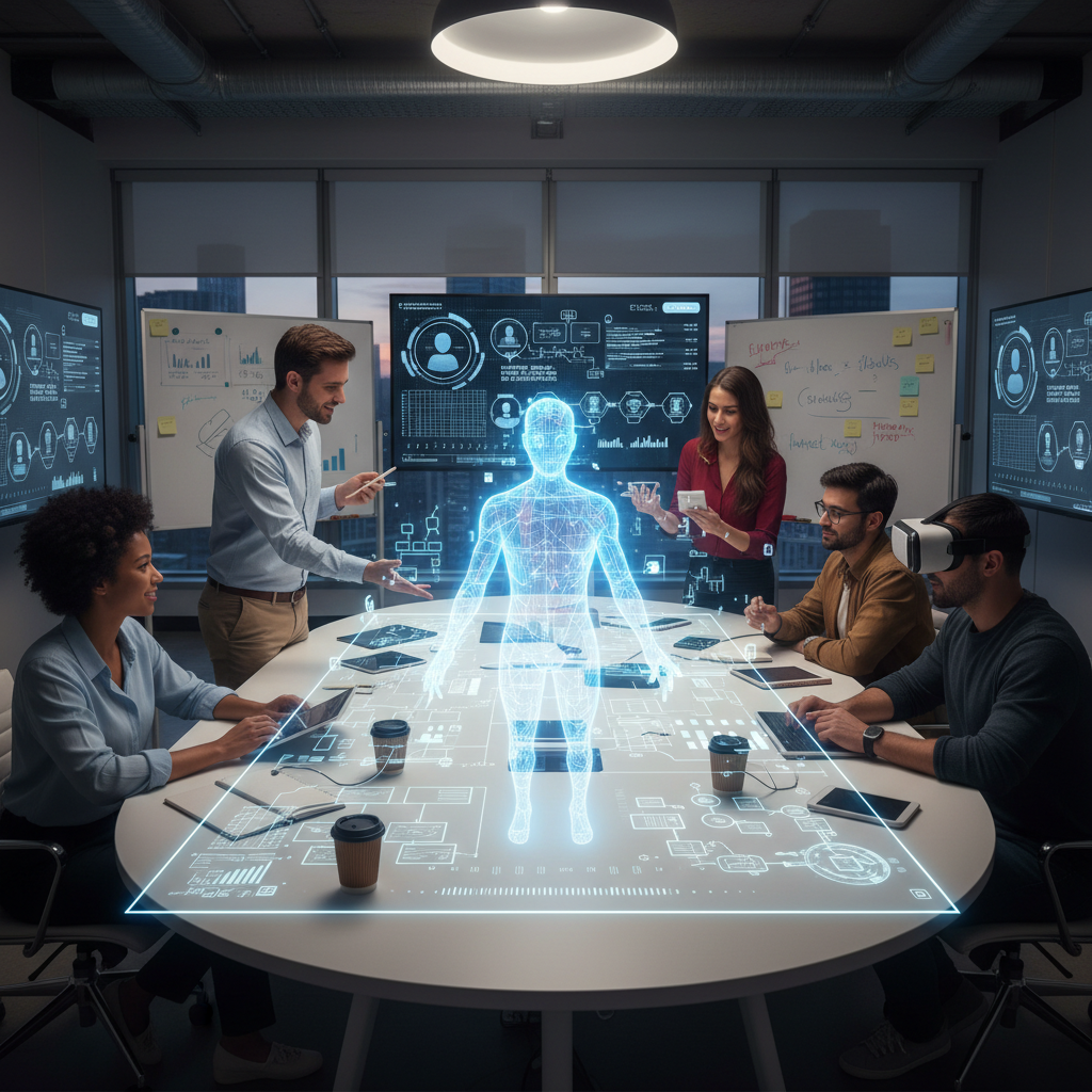 Alt text: Creative team in a modern office debating with a projected AI interface about the future of content creation.