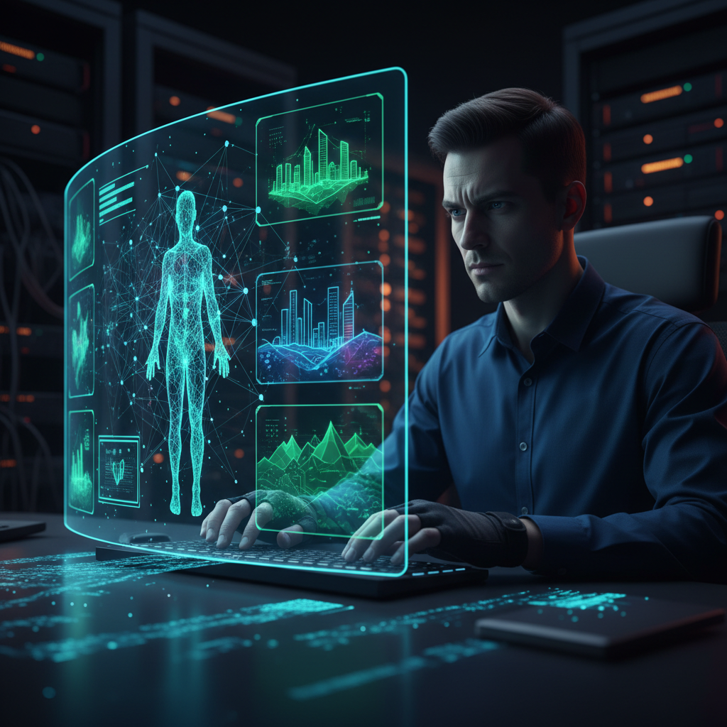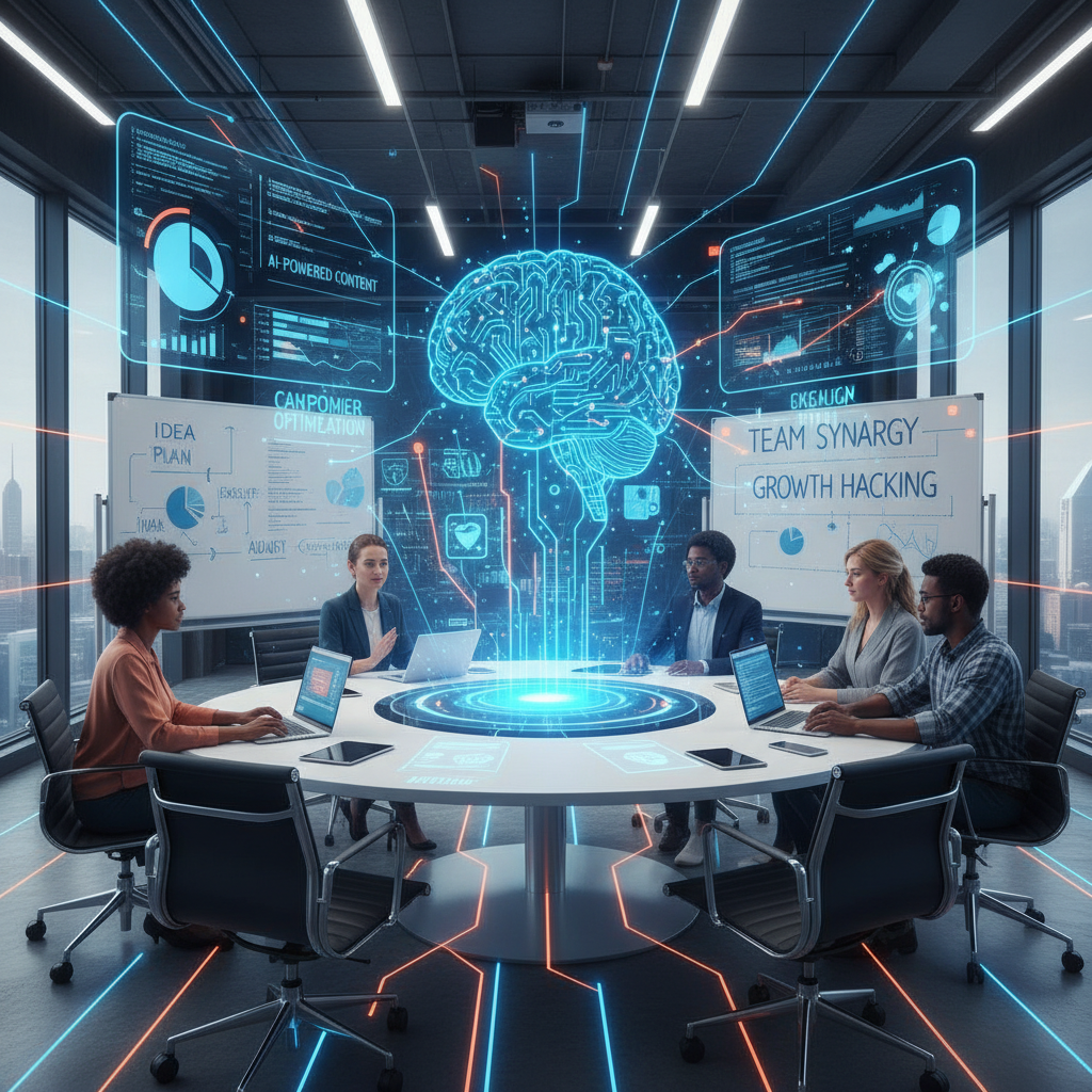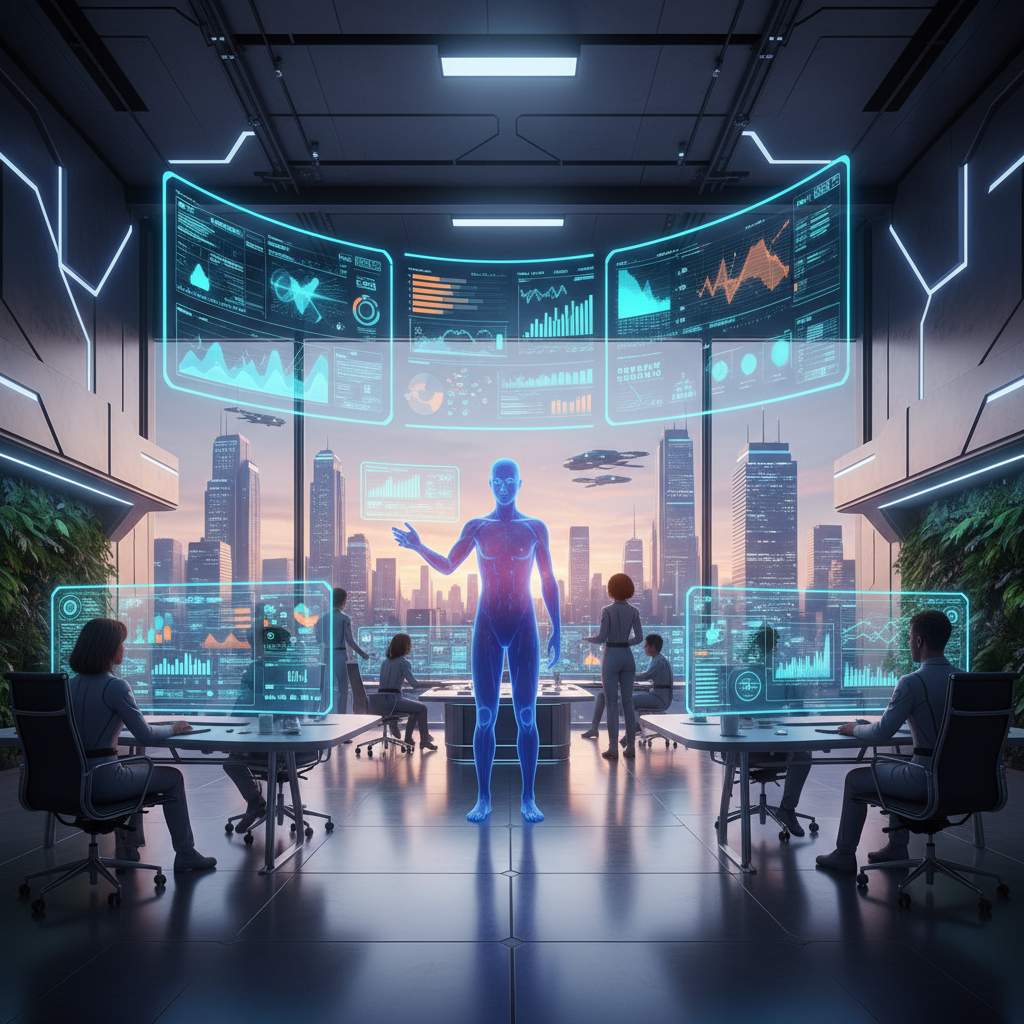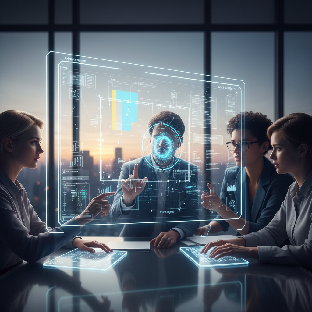 Alt text: Futuristic digital assistant hologram interacting with live team dashboards for customer segmentation