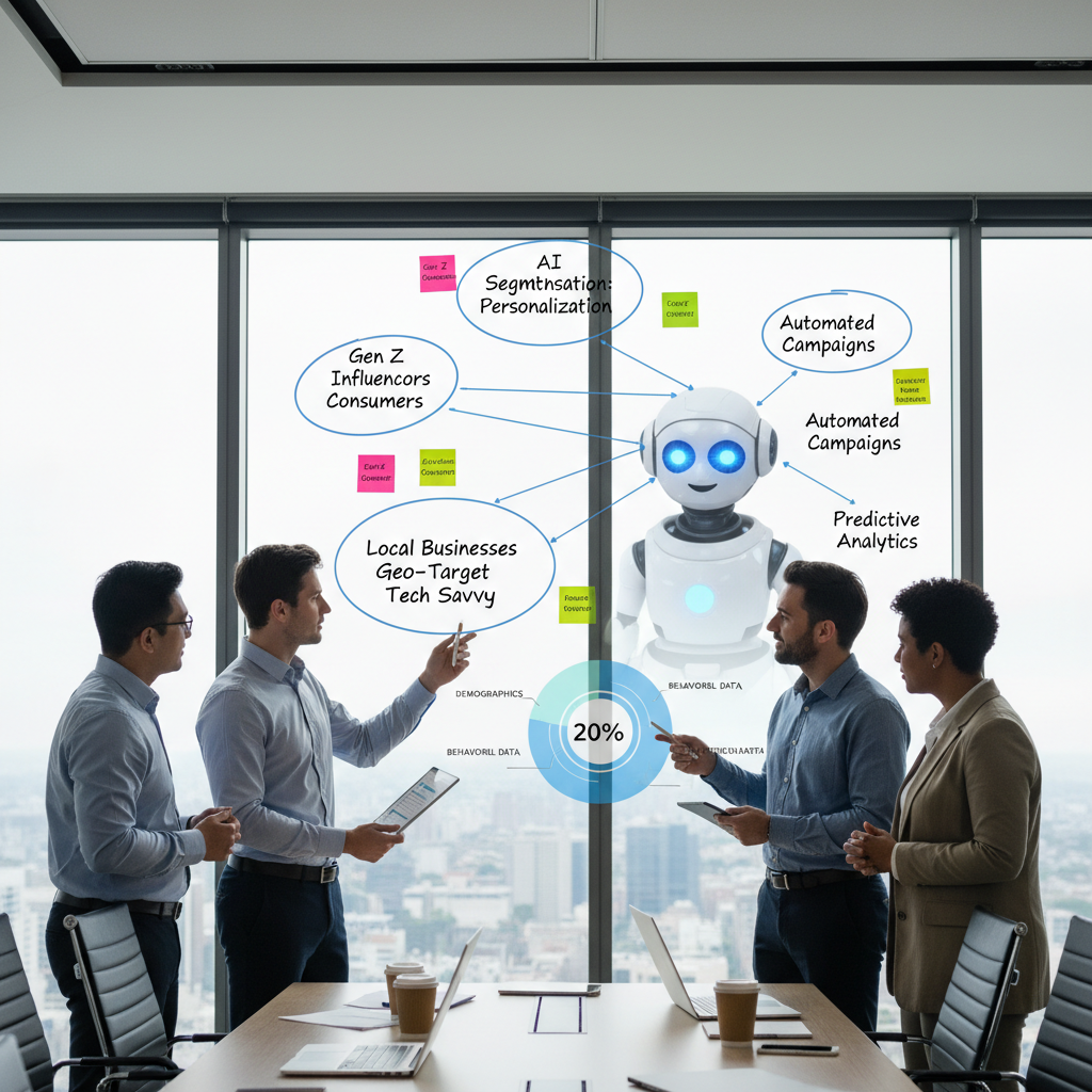 Alt text: Marketing team discussing AI segment outputs with post-it notes and a glowing assistant interface