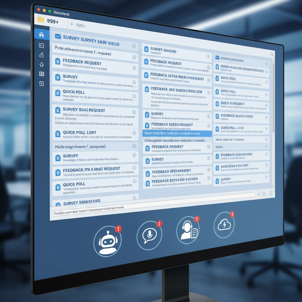 Alt text: Overstuffed inbox showing abandoned customer surveys piling up, highlighting AI-powered virtual assistant for customer surveys as a solution.