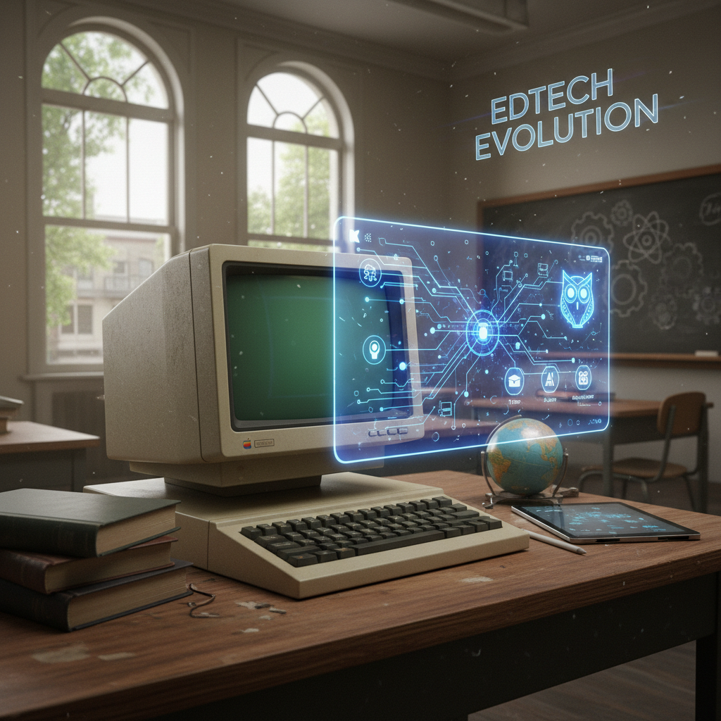 Alt text: The evolution from early digital education tools to modern AI-powered assistants in classrooms.