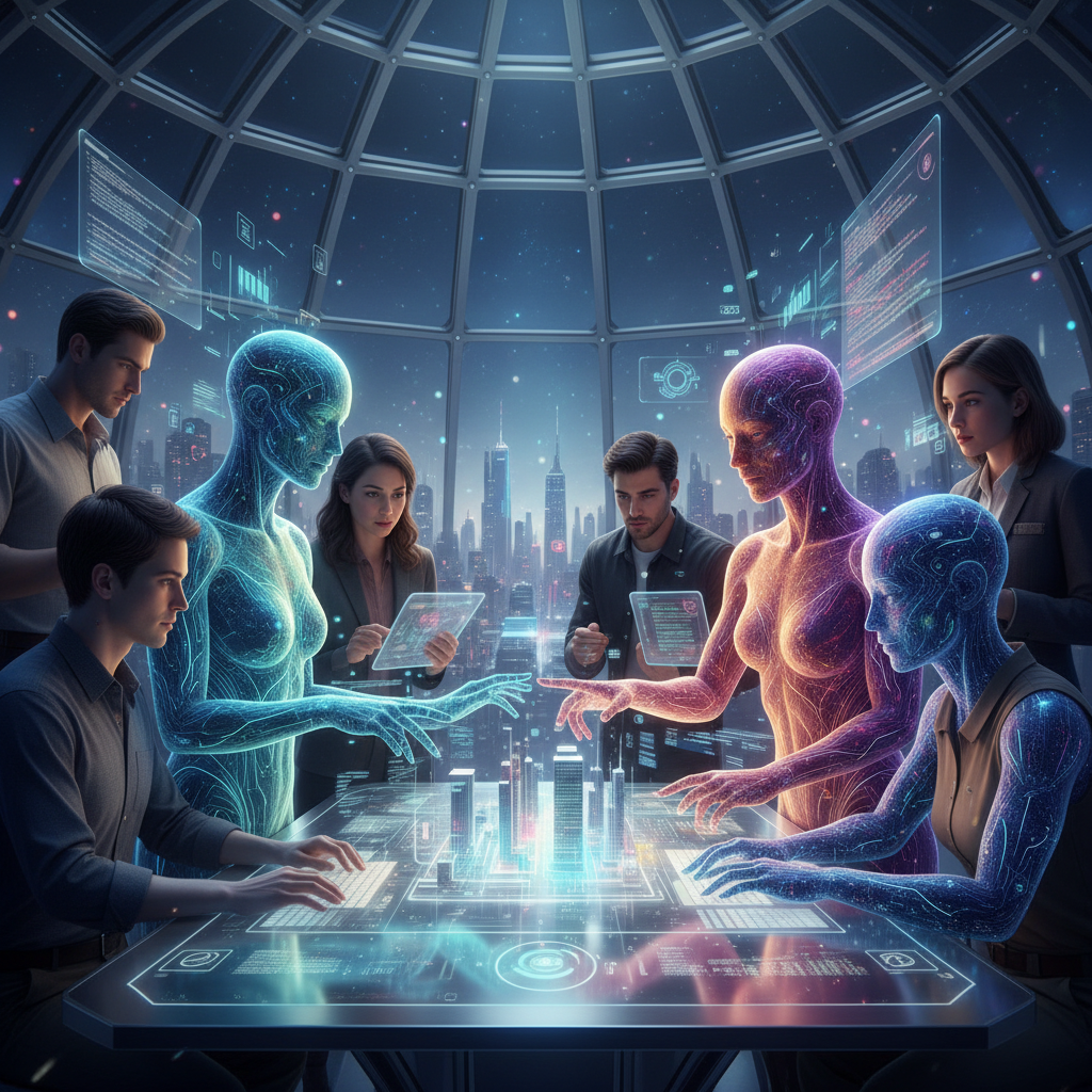 Alt text: Diverse team blending AI virtual concierge and human strengths, collaborating for productivity