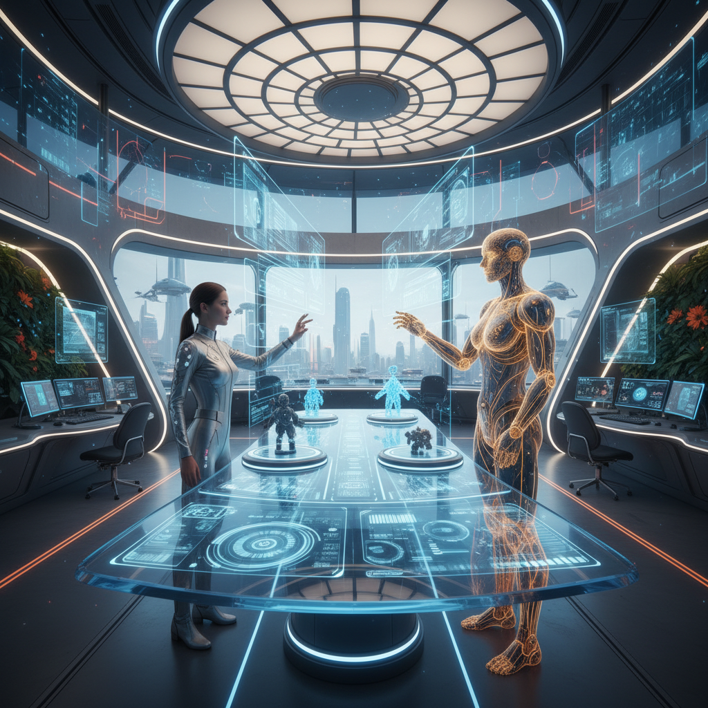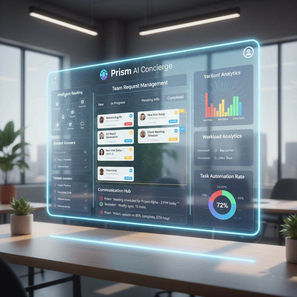 Alt text: AI-powered virtual concierge managing diverse team requests and workflows in a dynamic office environment