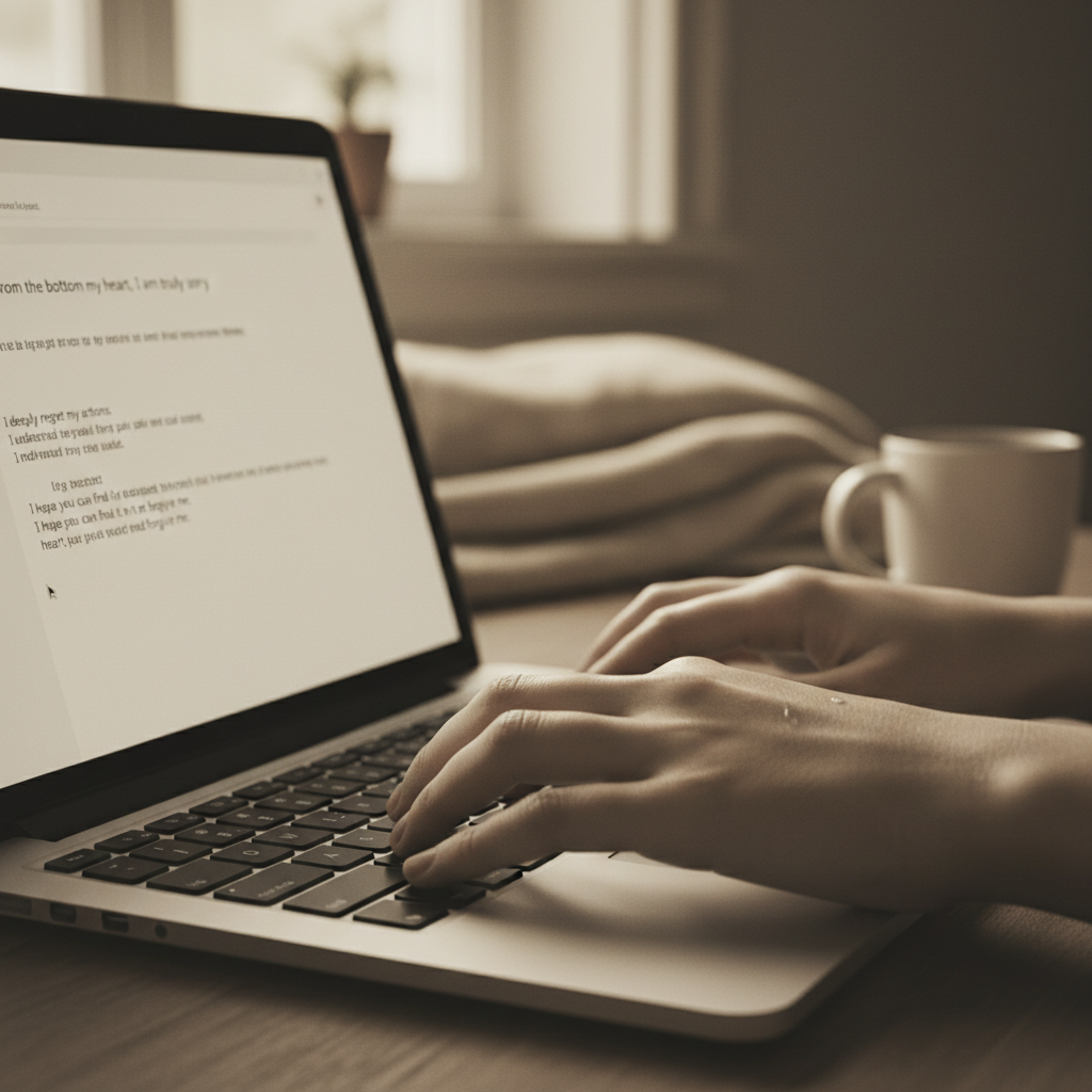 Close-up of hands typing a heartfelt apology email, emphasizing the art of nuanced communication in business.