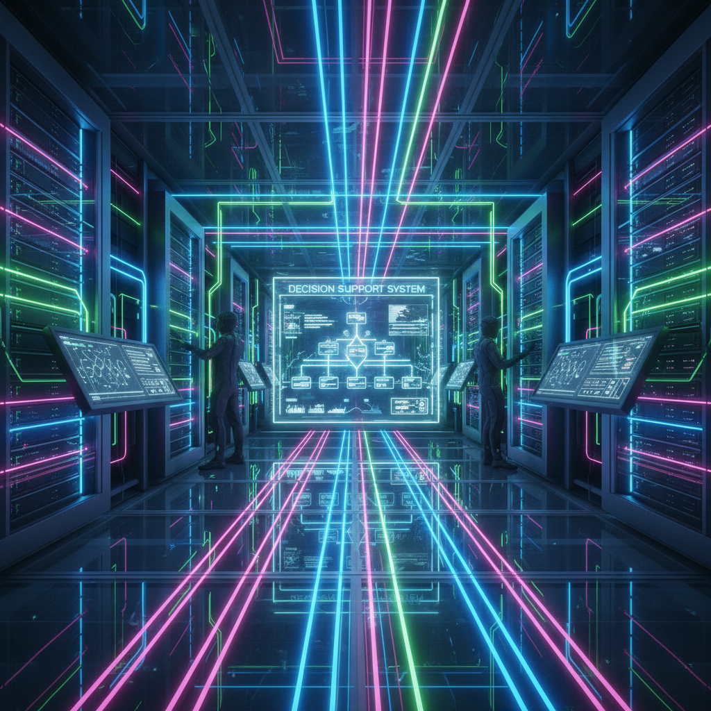 Dynamic digital data pipeline powering decision support—neon streams rushing through servers.