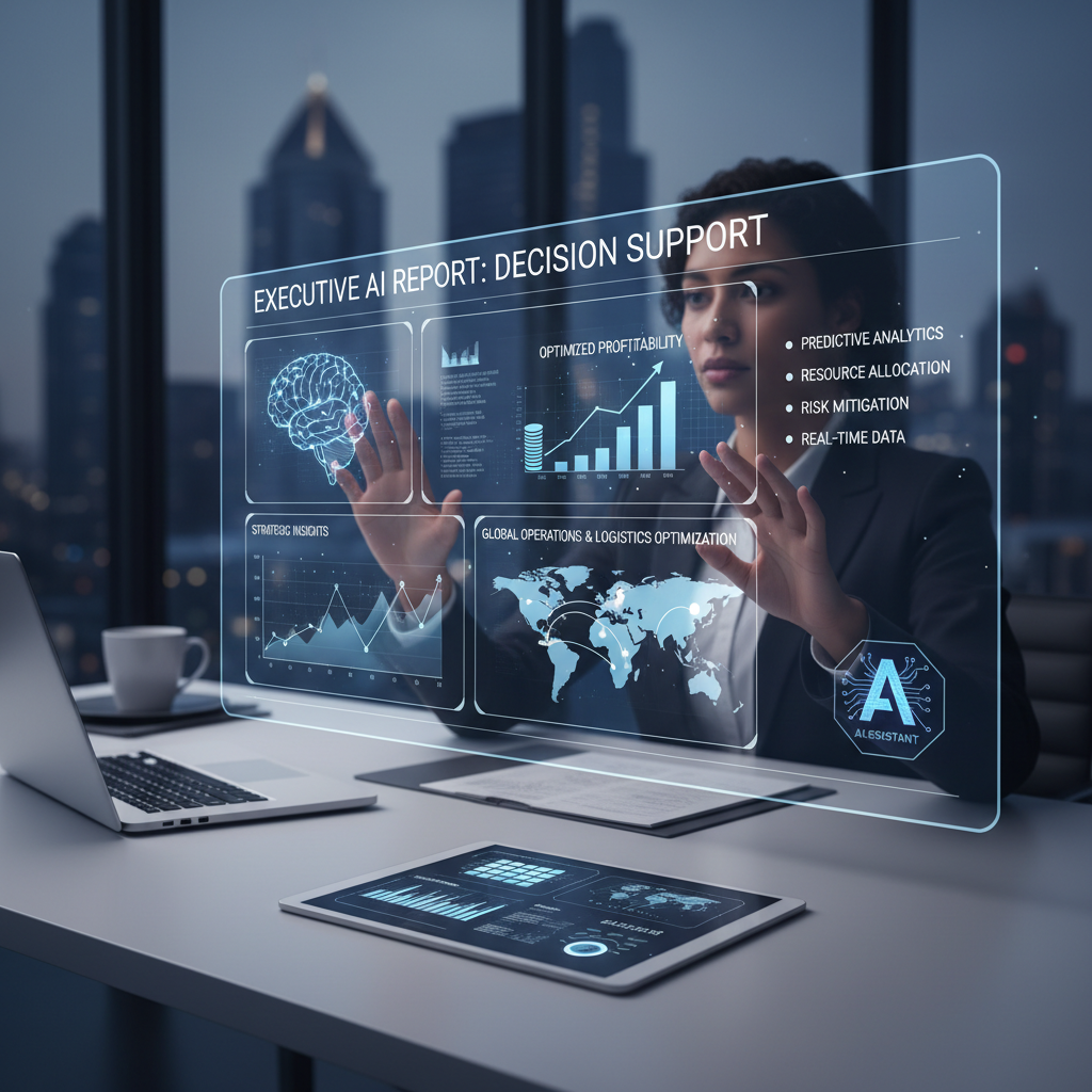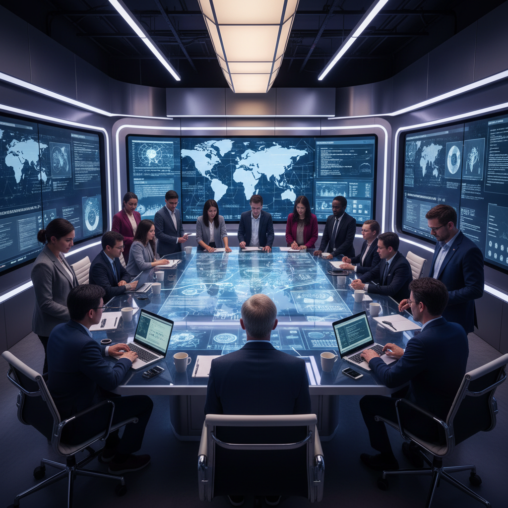 Executives in a tense boardroom, digital dashboards glowing—embodying the real-time pressure of automated strategic decision support.
