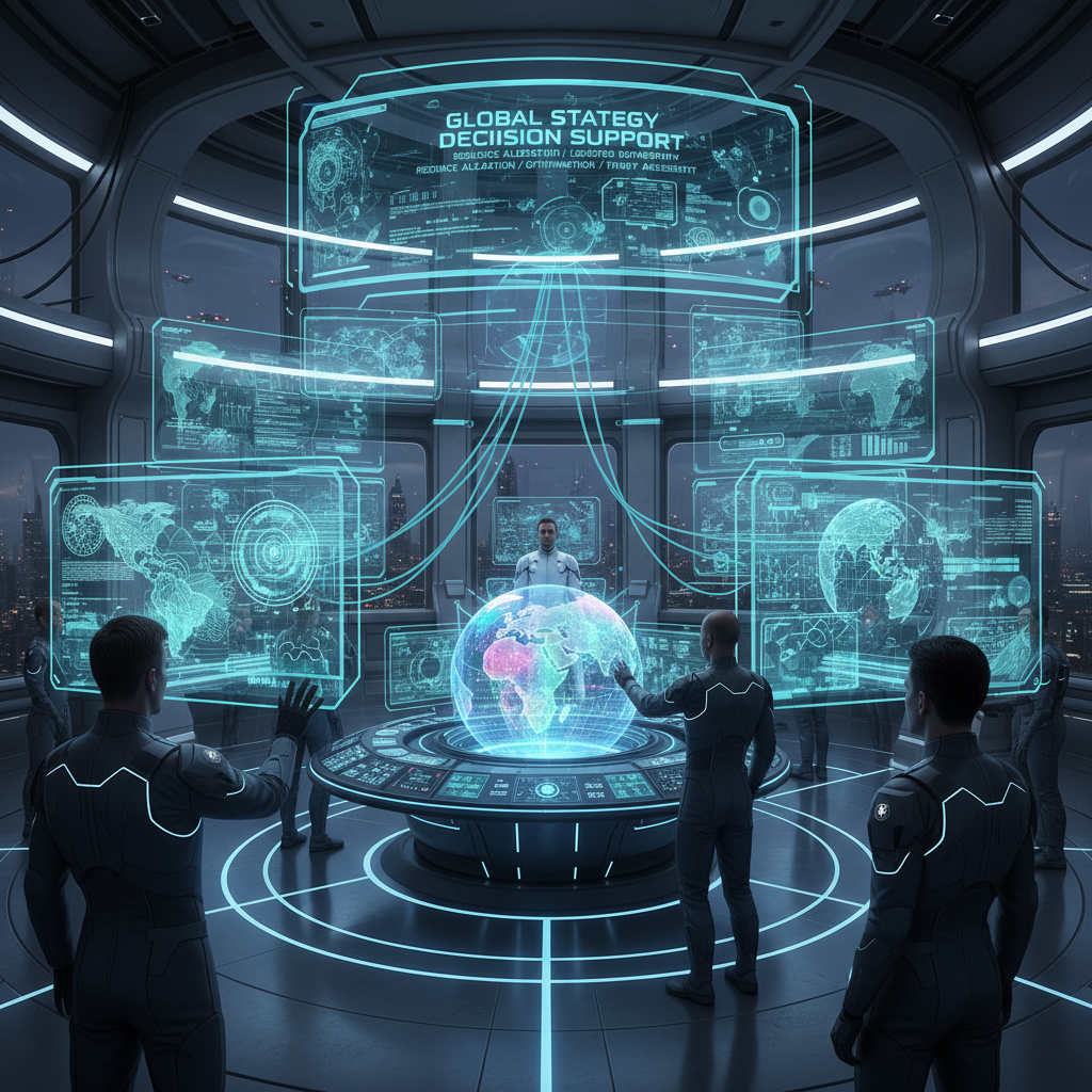 Futuristic control center blazing with holographic displays—next-generation decision support in action.
