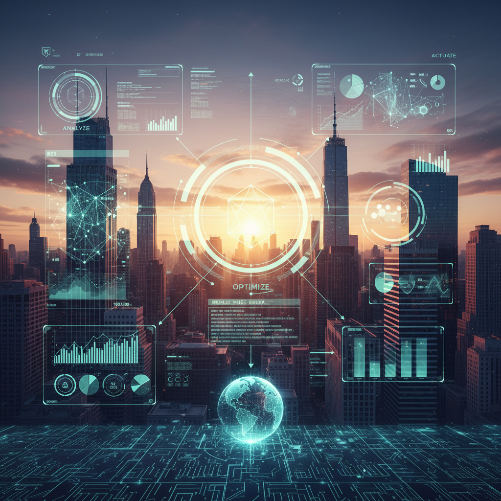 Sunrise over a cityscape with digital overlays—heralding the dawn of a new era in strategic decision support.