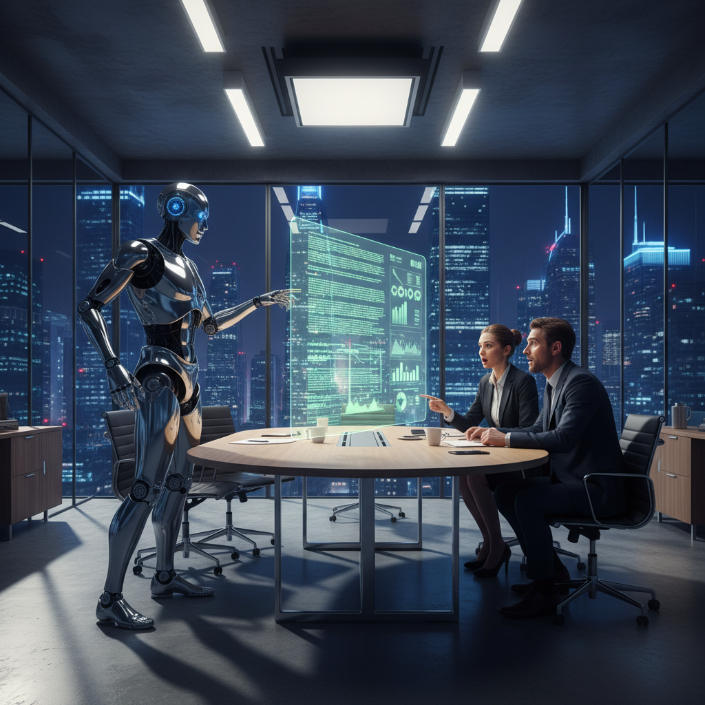 AI robot presenting automated report to executives—showcasing the utopian vision of AI-powered reporting solutions.