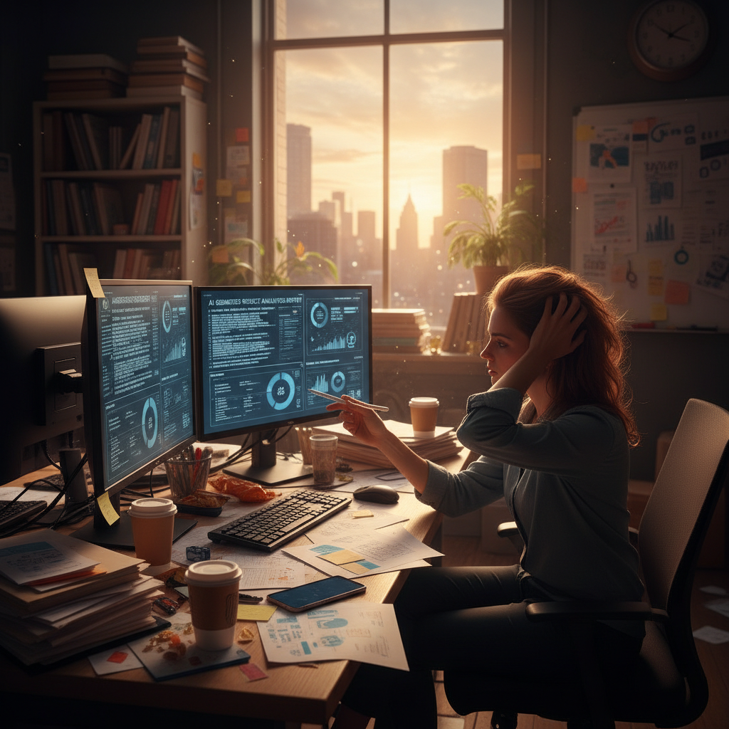 Frazzled project manager analyzing automated reports—captures the real human challenges behind digital transformation.
