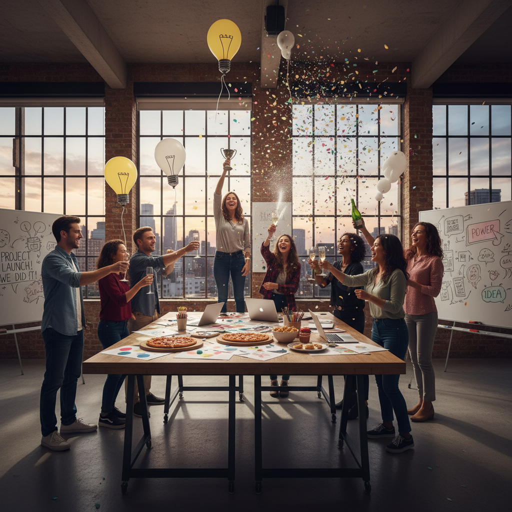 Image: Creative team celebrating in a modern workspace, data analysis tools for productivity.