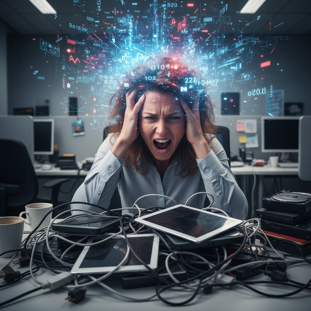 Image: Editorial image of frustrated worker surrounded by disconnected devices. Alt: Overwhelmed professional with too many data sources.