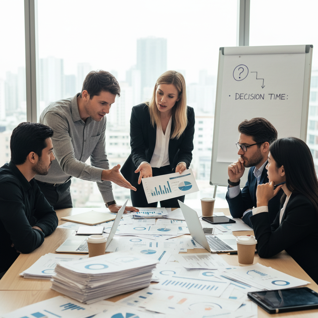 Image: Editorial shot of a team debating over data printouts. Alt: Team using data to inform decisions.