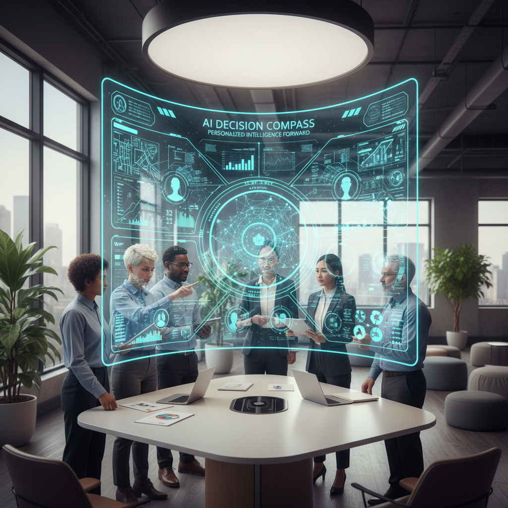 Alt: Desk split between analog decision tools like paper charts and digital tools like glowing AI interfaces