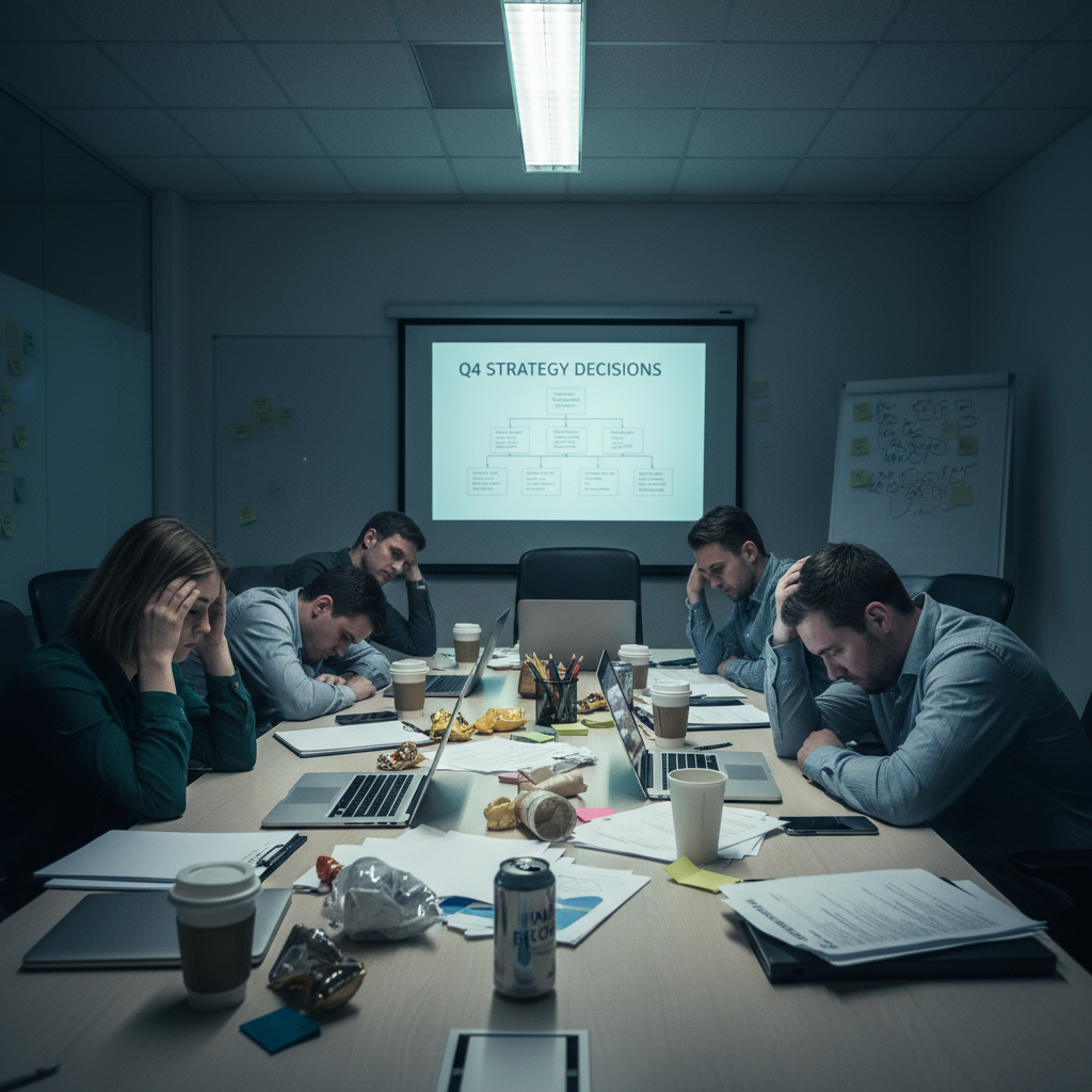 Alt: A tense team at work watches a ticking clock, exhaustion and decision-making stress evident on their faces