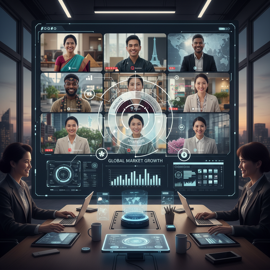 Alt: International team in a video conference using decision-making tools, cultural icons in background