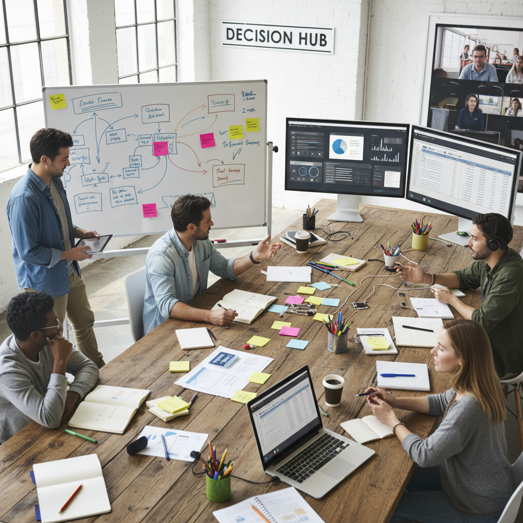 Alt: Diverse team in an informal office setting collaborating with both analog and digital decision-making tools