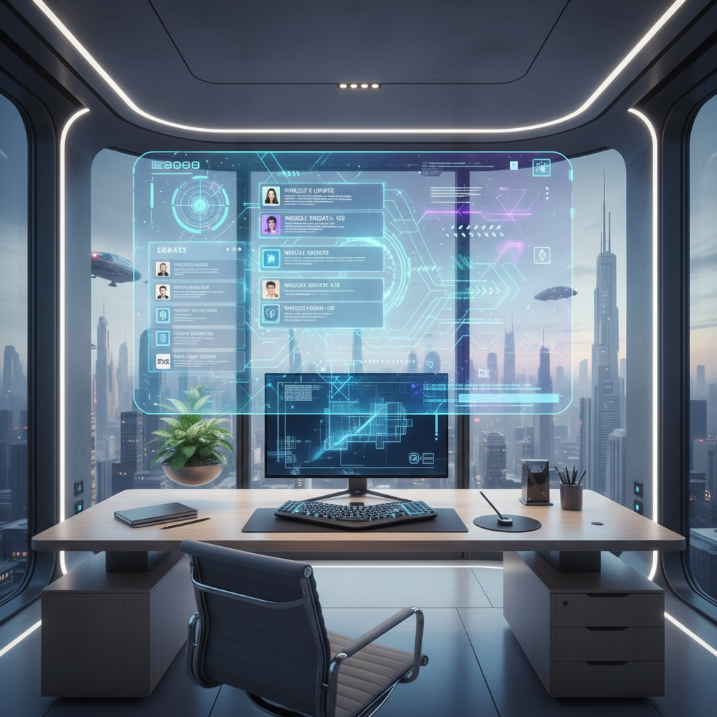 Alt text: Email interface with glowing AI elements in a modern workspace, highlighting financial automation features.