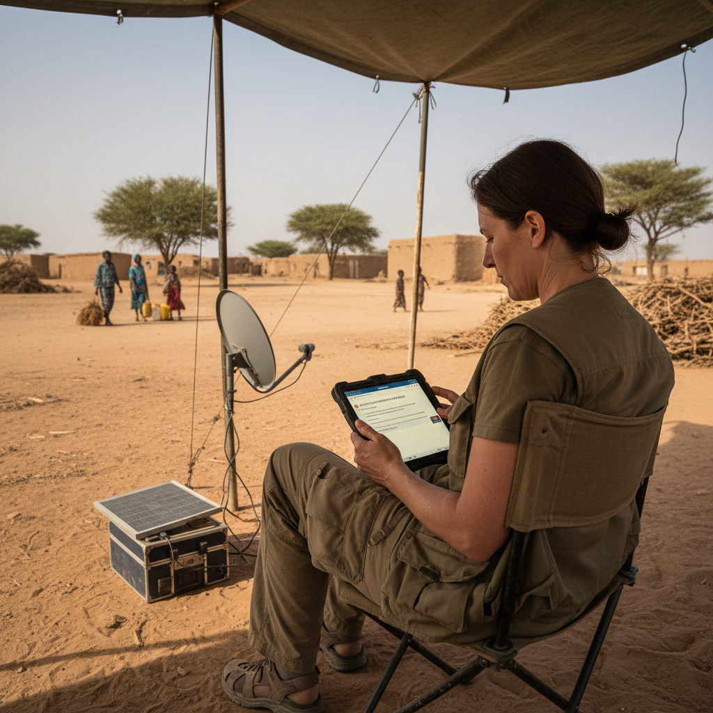 Alt text: Aid worker in rural environment receiving vital data via email-based report on tablet.