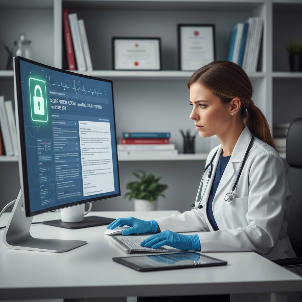 Alt text: Doctor reviewing patient data securely via email-based report in a clinical setting.