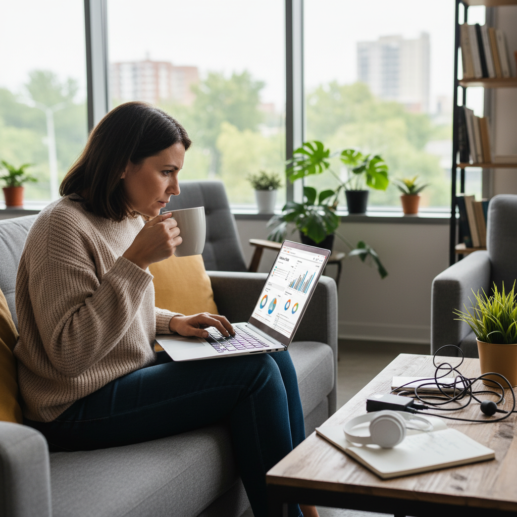 Alt text: Remote worker analyzing automated email-based report on laptop in home setting.