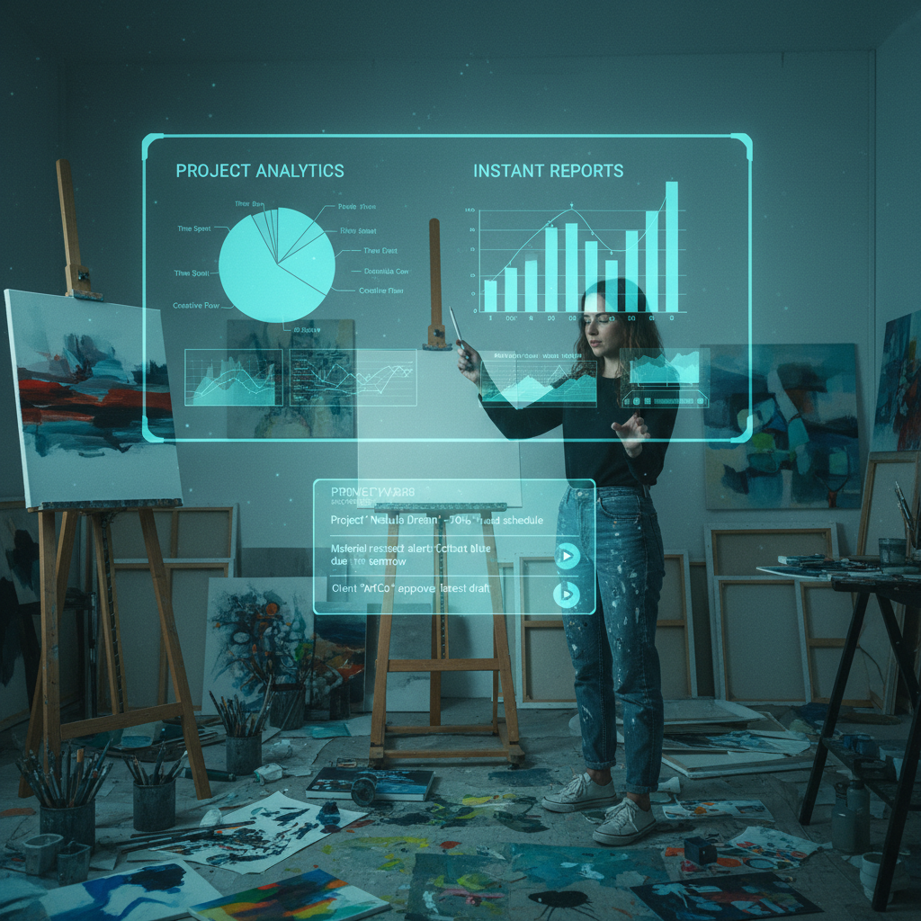 Photo: Creative professional in a studio reviewing instant project analytics on a tablet, highlighting non-corporate uses.