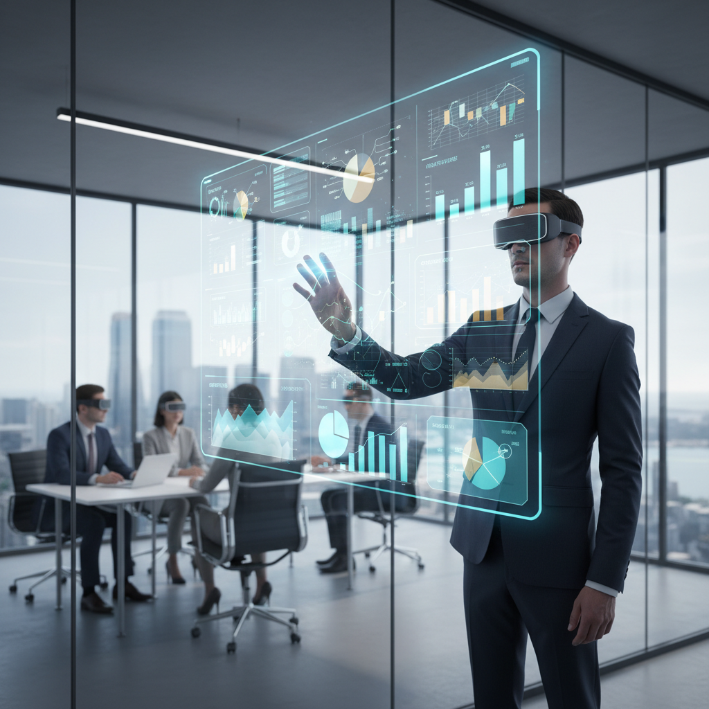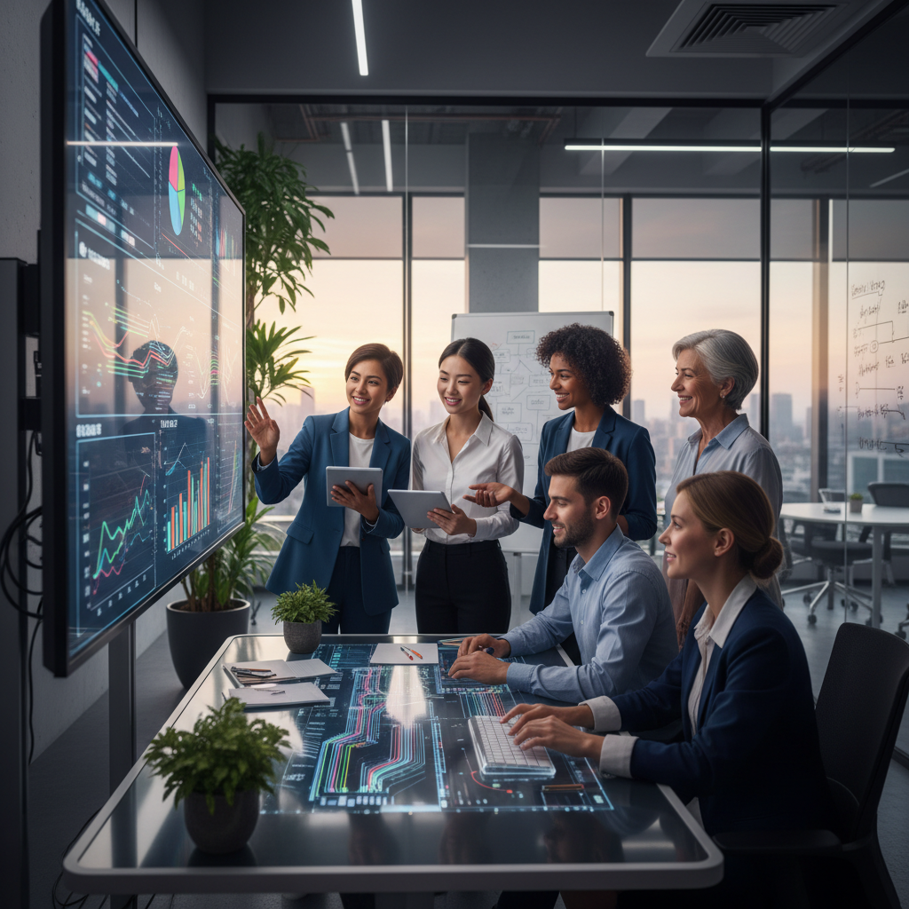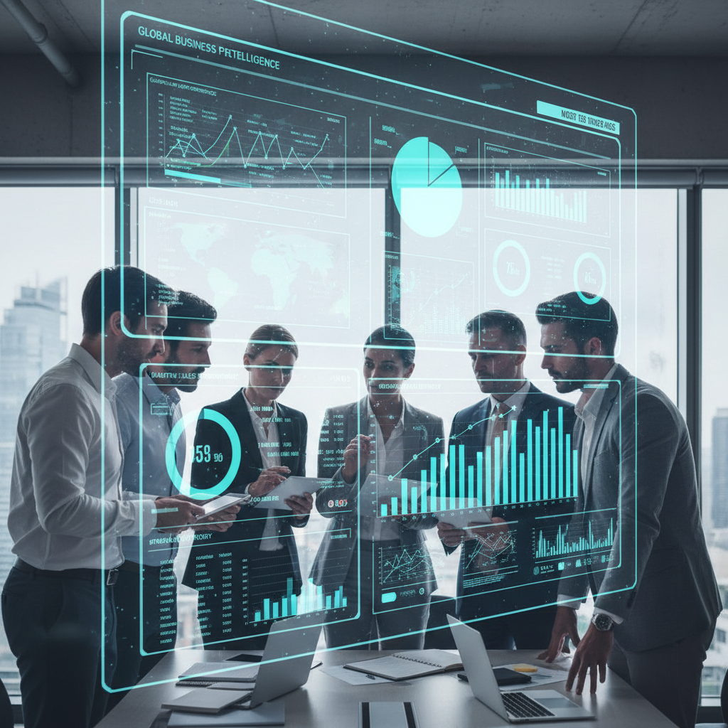 Photo: Futuristic business team viewing AI-driven data integration for instant business reports, symbolizing automation in analytics.