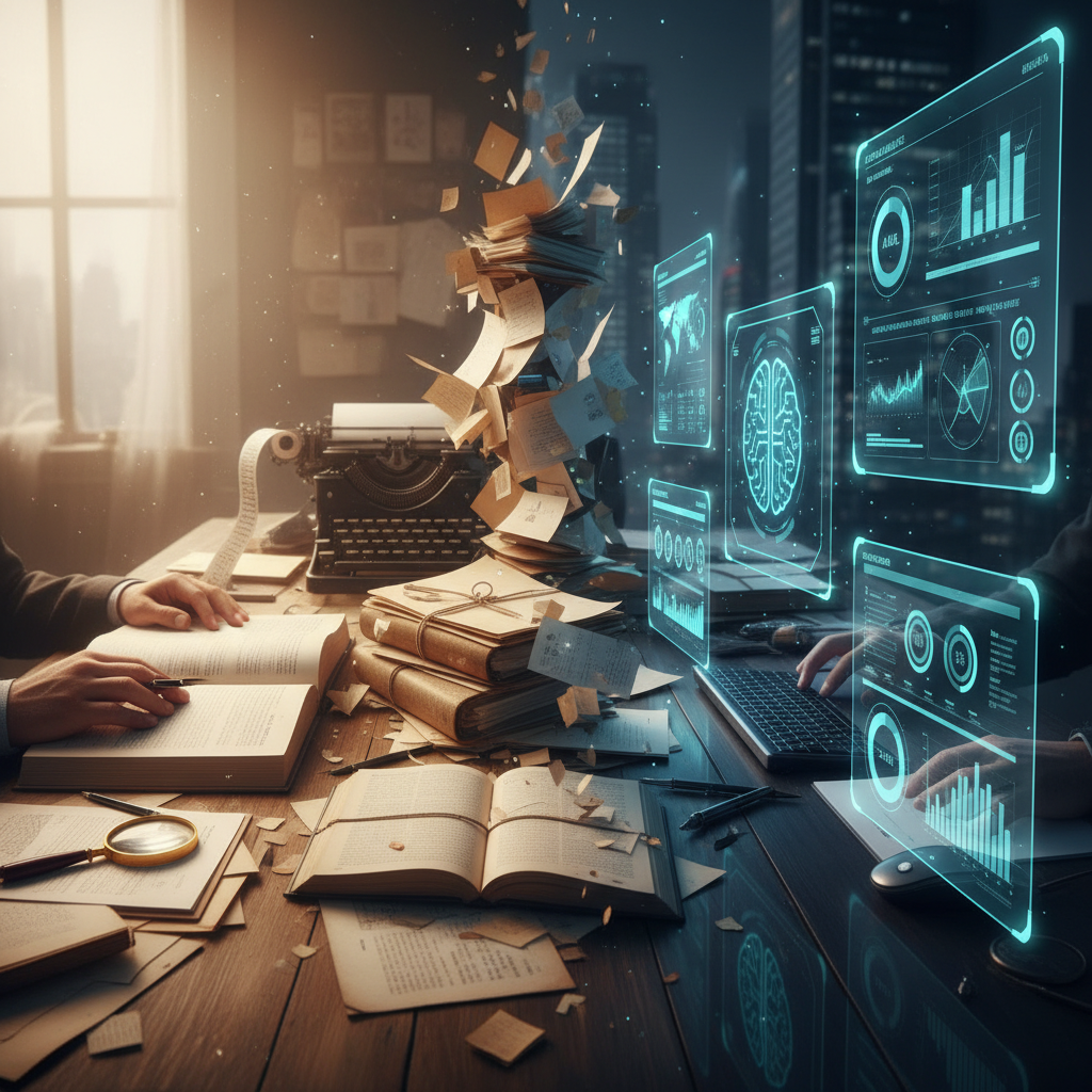 Photo: Modern business reporting dashboard over old paper files, showing the evolution from manual to instant AI-powered analytics.