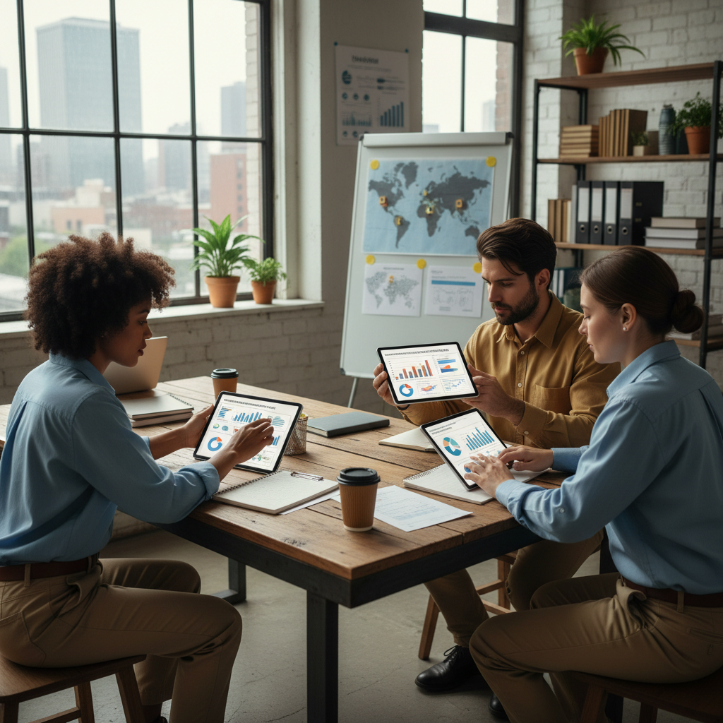 Photo: NGO staff in the field using tablets to access instant business reports, demonstrating real-world impact.