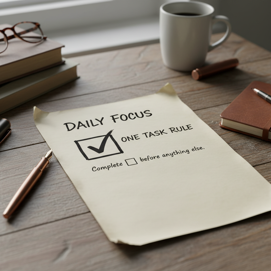 - Write a single, urgent task on paper: Physical writing activates intention.