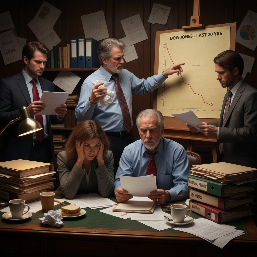 Alt: Stressed investors surrounded by traditional advice and paper charts look overwhelmed in a busy office.