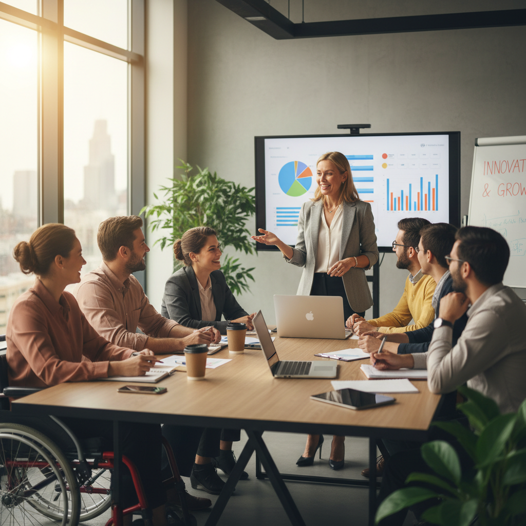 Narrative shot of a CEO leading an engaged, inclusive meeting—showing the cultural impact of smart meeting organizer software.