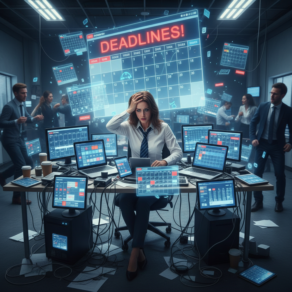 Overwhelmed worker surrounded by digital calendar overload, visually capturing the essence of modern meeting software struggles and unproductive time.
