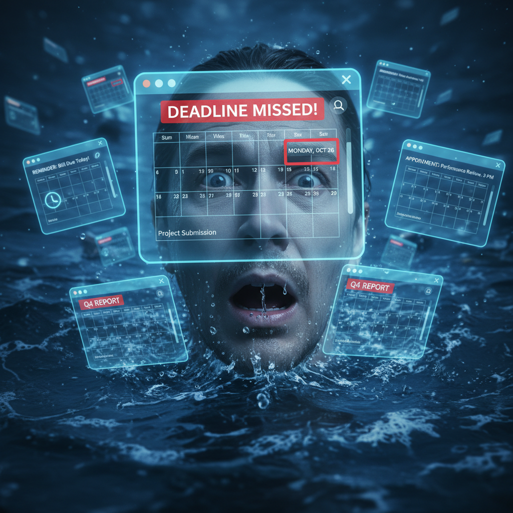 Person drowning in a sea of pop-up windows and calendar alerts, visually representing the perils of over-featured meeting organizer software.