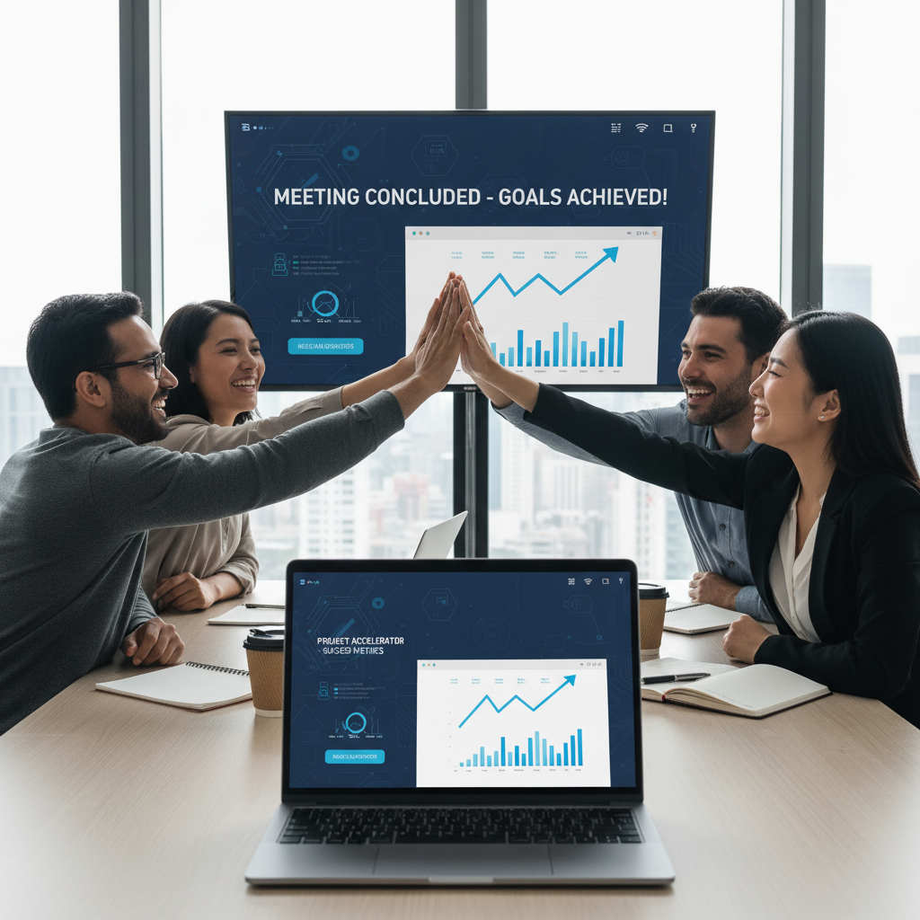 Editorial photo of a satisfied team celebrating success over a laptop—capturing the joy of meetings that actually work.