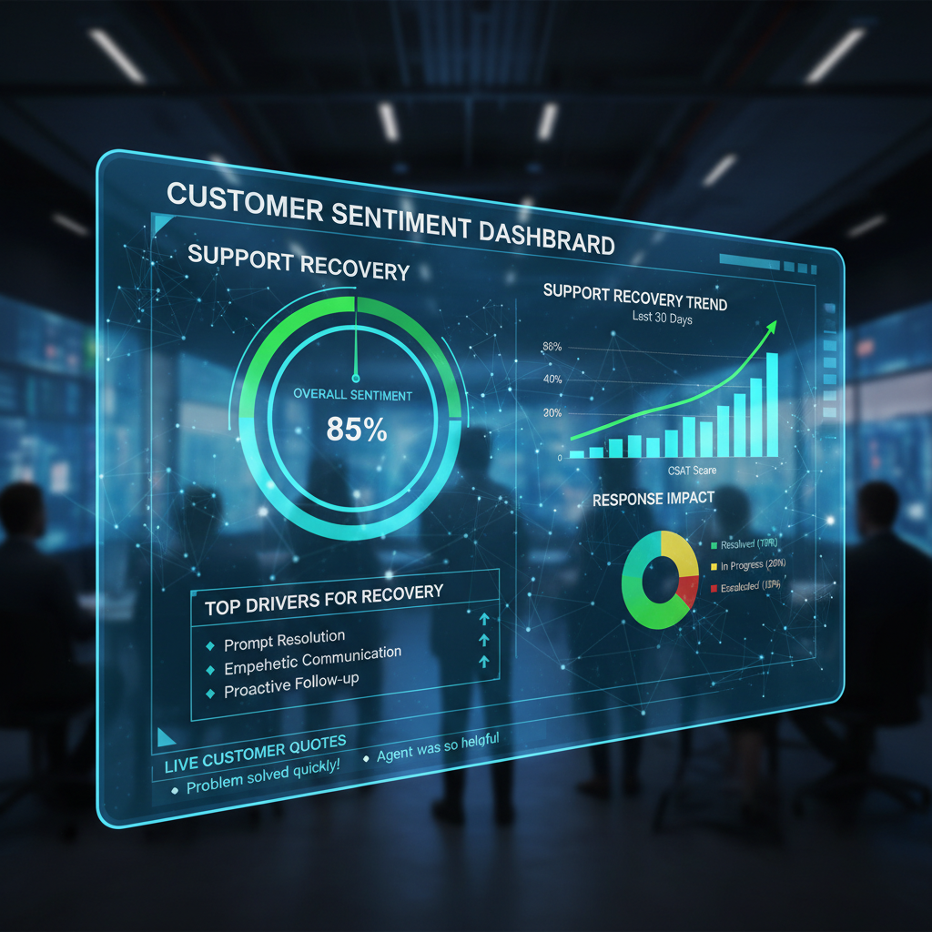 Alt text: Customer sentiment dashboard showing sharp recovery after support incident, illustrating the impact of effective crisis management.
