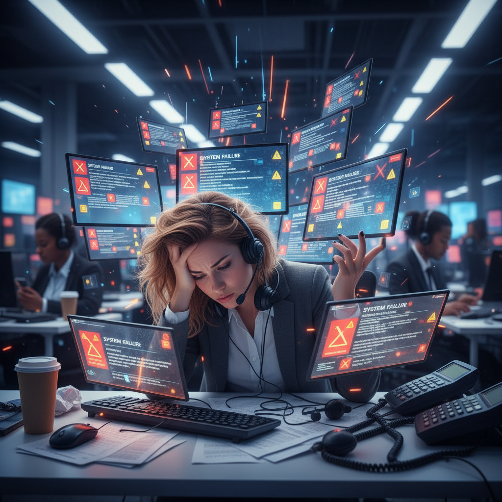 Alt text: Overwhelmed customer support agent making mistakes under pressure due to instant support demands.