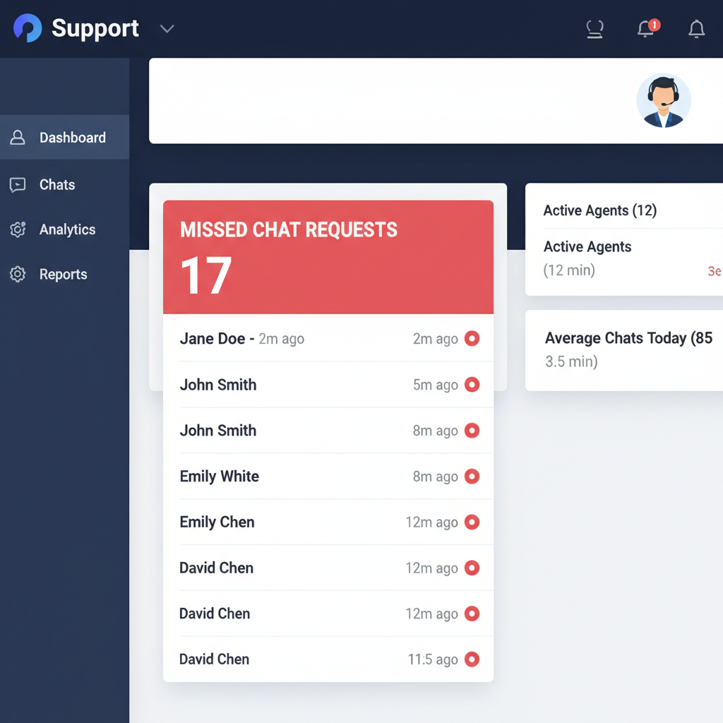 Alt text: Support dashboard showing multiple missed urgent chat requests, exemplifying the failures of instant support tools.