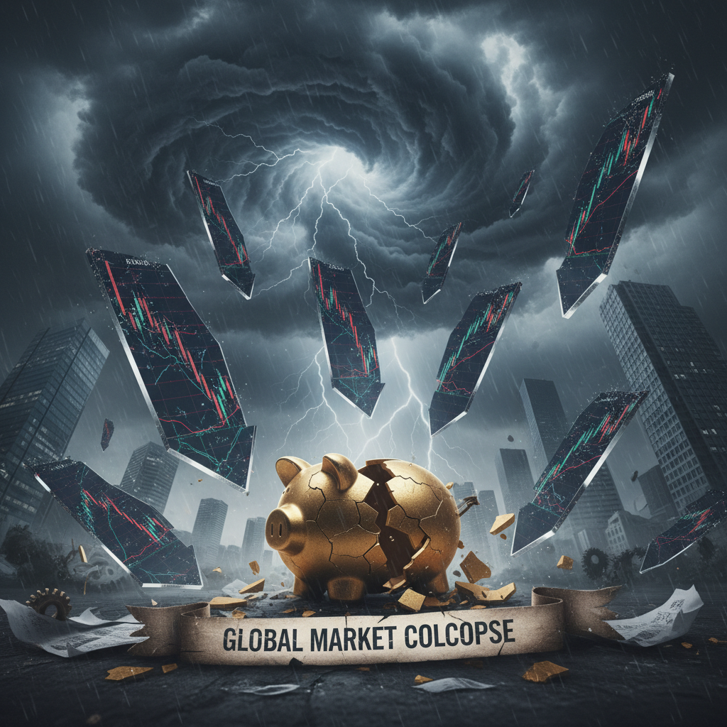 An office in chaos, papers flying, monitors showing plummeting market trend charts—visualizing business crash due to missed market trends.